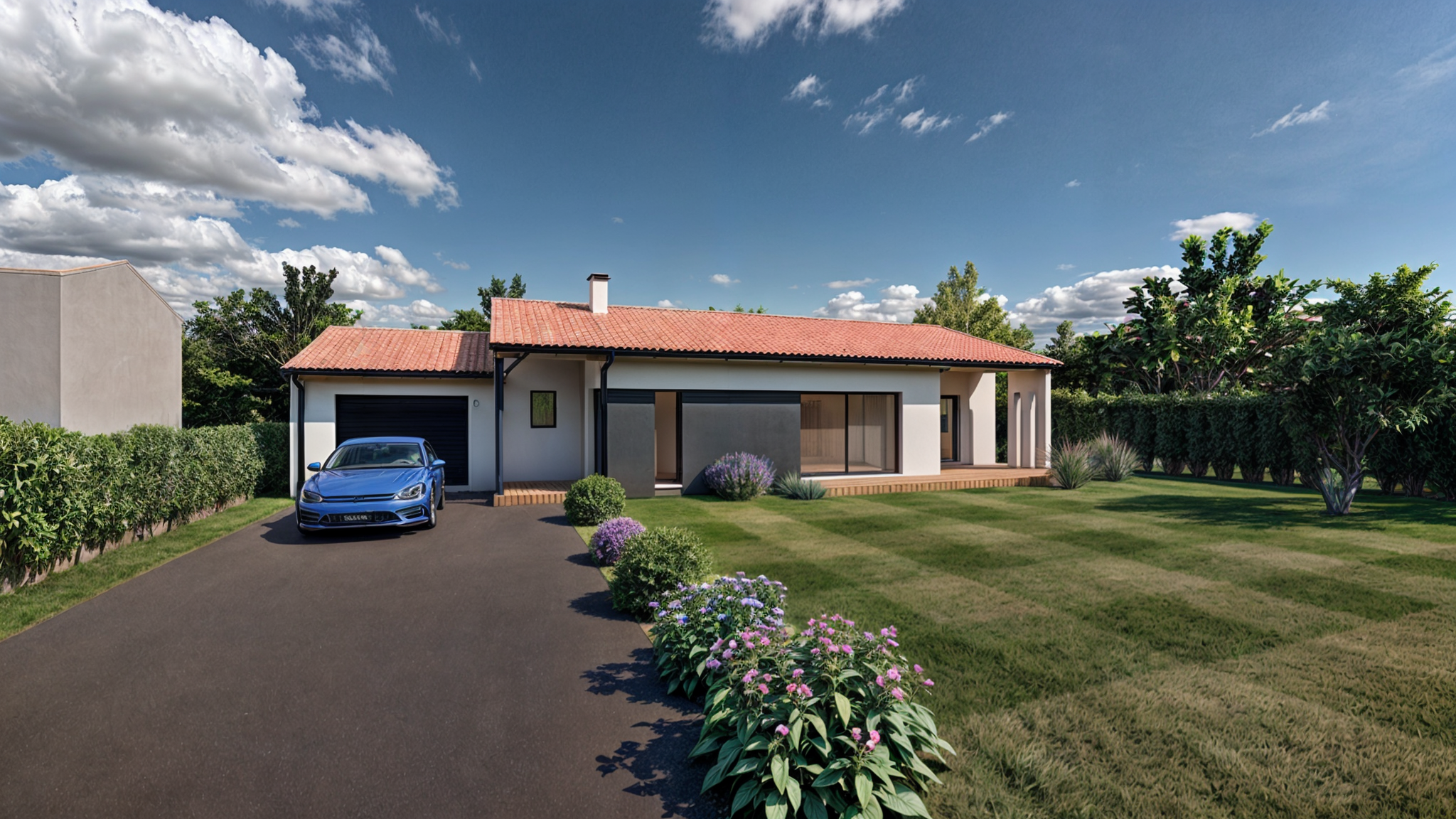 Découvrez cette magnifique maison moderne de plain-pied, dotée d’un toit en tuiles de terre cuite qui lui confère un charme à la fois contemporain et chaleureux. La propriété s’étend sur un vaste terrain agrémenté d’une pelouse parfaitement entretenue, créant un environnement verdoyant idéal pour des moments de détente en plein air.